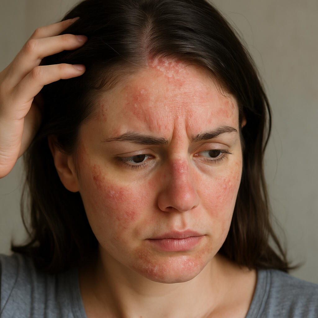 A dermatite seborreica é uma condição inflamatória crônica e comum que afeta predominantemente áreas da pele ricas em glândulas sebáceas. O couro cabeludo é um dos locais mais afetados, mas ela também pode se manifestar no rosto (especialmente testa, sobrancelhas, atrás das orelhas e nas laterais do nariz). Suas características mais visíveis são as placas avermelhadas e a descamação, que pode ser fina e esbranquiçada (a famosa caspa) ou mais espessa e amarelada, muitas vezes com aspecto oleoso. É importante ressaltar que, apesar do incômodo, essa inflamação não é contagiosa, mas tende a ser persistente e recorrente, exigindo um manejo contínuo e cuidadoso.